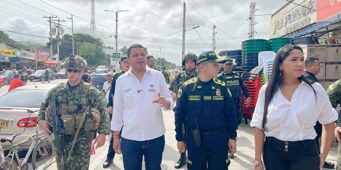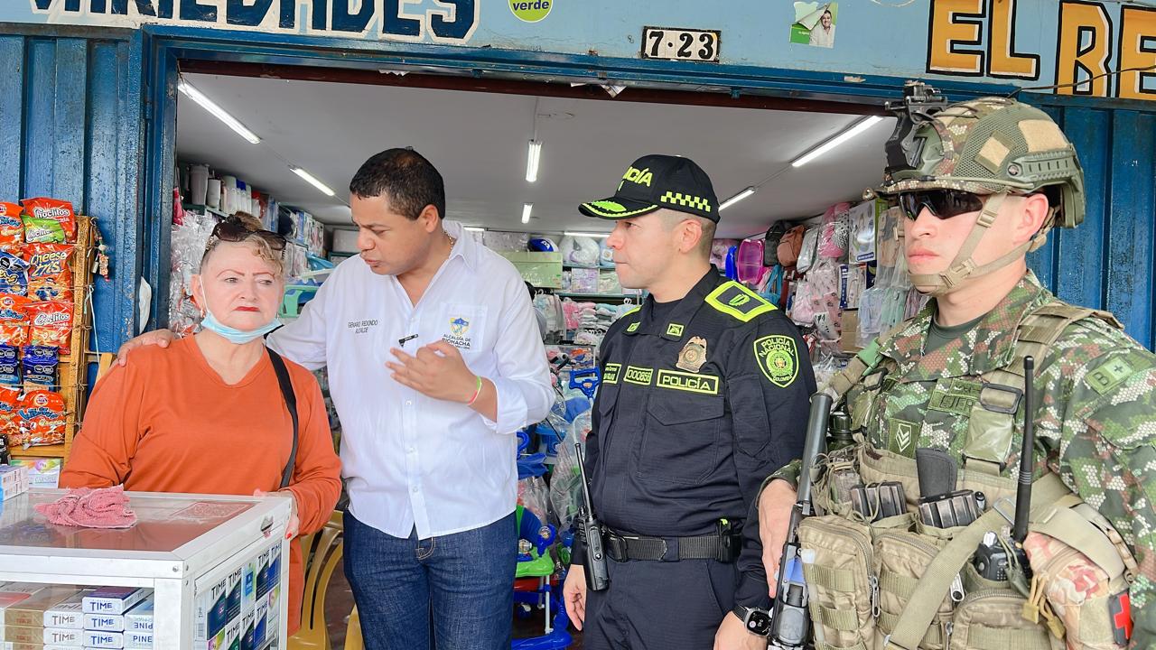 “Estamos en este recorrido con la Policía y el Ejército, junto a sus unidades del Gaula y el Instramd, para reiterar nuestro respaldo a los comerciantes, con quienes mantenemos un diálogo abierto y permanente”, manifestó el alcalde Genaro Redondo Choles durante la visita.